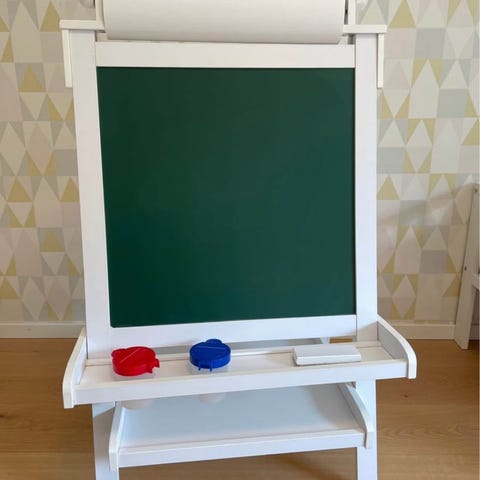 På ena sidan finns det en griffeltavla och andra sidan en magnettavla/whiteboard.