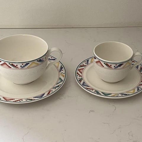 Villeroy & Boch te/ kaffekoppar med fat tillverkade i porslin. Kopparna har ett mönster i bruna toner på vit botten. Setet innehåller fem koppar/ muggar med tillhörande fat, utformade för servering av kaffe eller te. Mått cirka 10 cm i höjd och 12 cm i diameter för kopparna.