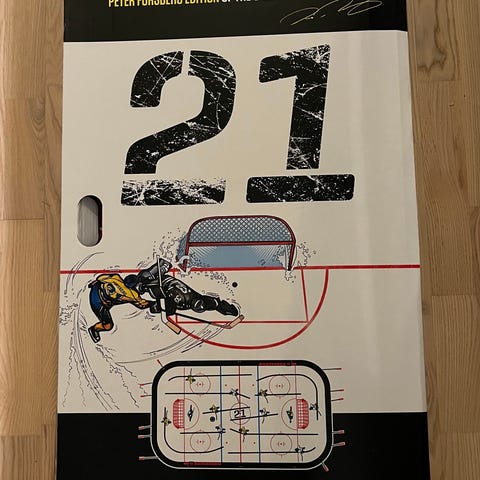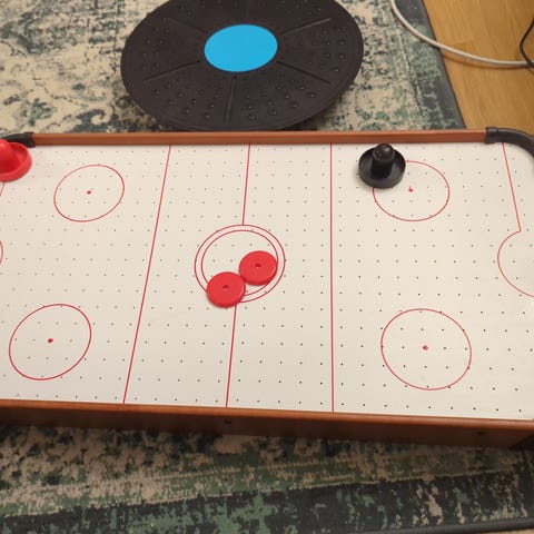 Bordshockeyspel med nät och skydd i svart och rött. Spelplanen är utformad som en ishockeyrink med målmålningar och spelarpinnar. Nätet är fäst runt ramen för att hålla pucken inom spelområdet. Passar för inomhusbruk.