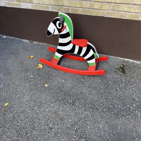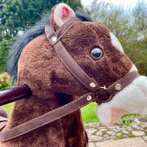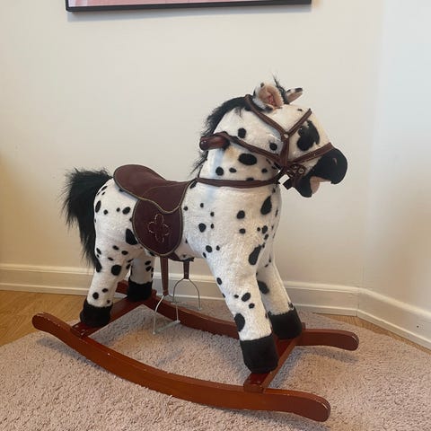 1. Mjuk häst med gnägg- och klapprande hovljud. Kan användas antingen som gunghäst eller med hjul att åka på. Superenkelt att skifta emellan. Fint skick! 200kr.