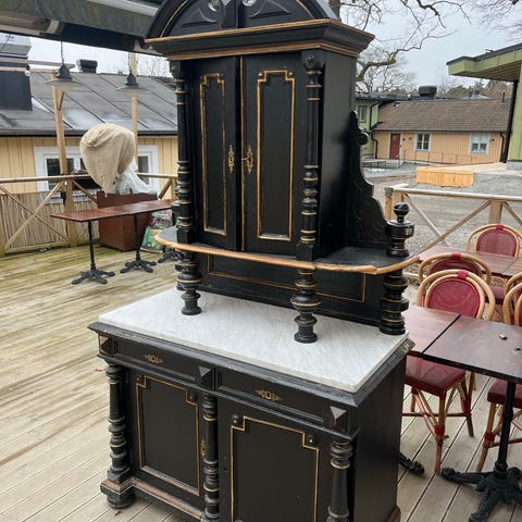 Antikt skåp med vitrindel och glashyllor. Vintage retro. Sekelskifte