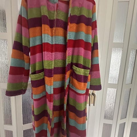 Röd och vit morgonrock i fleece. Skärp, fickor, huva och en knapp i brösthöjd som håller ihop morgonrocken. Nästan oanvänd för barnet växte fort. Strl 134-140