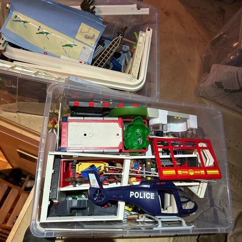 Stor låda med diverse Playmobil inkl. Polisstation och Insatsstyrka med fordon, helikopter och båt. En stor brandbil och många figurer.