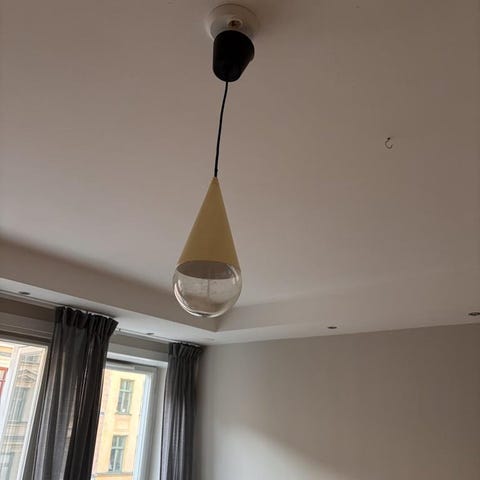 Fin taklampa i glas och gulddetaljer. Kräver hög takhöjd eftersom lampan är rätt avlång. Passar mycket fint i en hall eller port.