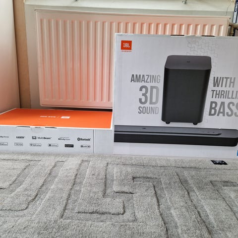 Förstärk ditt Tv-ljud med denna JbL högtalare. Väggfäste och fjärrkontroll ingår.