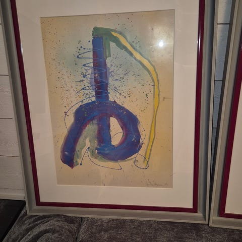 Marufuku 1990 konstverket Ilska i ram. Färgstarkt motiv med abstrakt ansikte och uttrycksfulla penseldrag. Tavlan är inramad med en ljus träram och skyddad av glas. Passar för väggupphängning som dekorativ konst. Storlek 156 cm*60 cm.