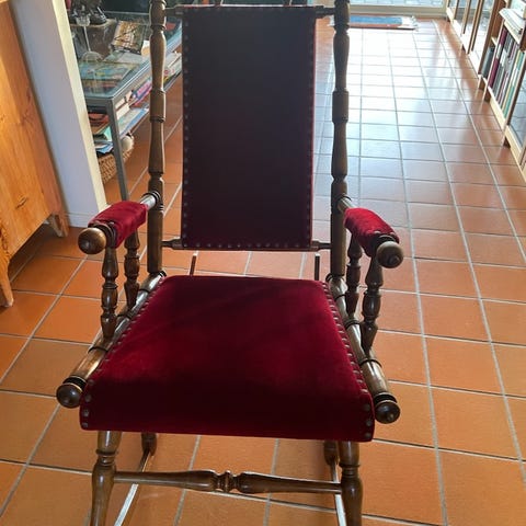 Gungstol i svart med detaljer i guld som bleknat bort. Stolen har en klassisk design med spjälor i ryggstödet och är avsedd för vuxna. Passar för inomhusbruk som en sittmöbel med gungfunktion.