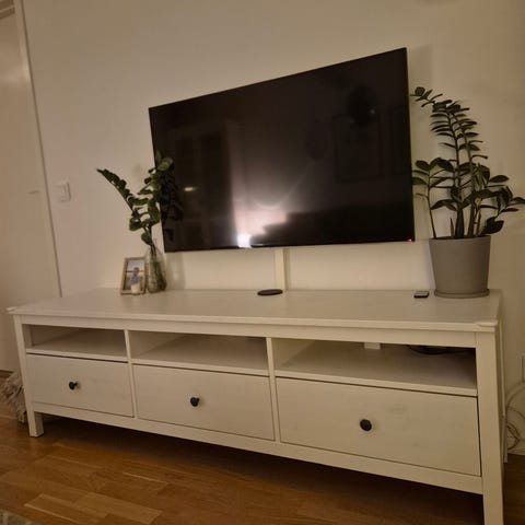 Stor och rymlig byrå/ TV- bänk med vit, glansig yta! Väldigt fint skick!
