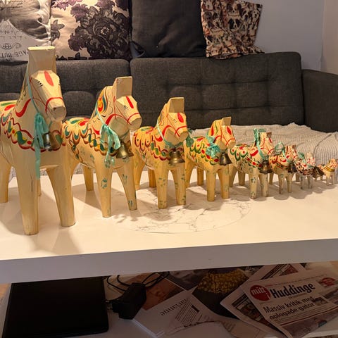 Grannas A. Olsson Dalahäst träfigur i orange färg med traditionell målning. Handgjord trähäst från Nusnäs, Sverige, känd för sin dekorativa och kulturella betydelse. Inköpt på Leksands hemslöjd. Väldigt fint skick, dessutom signerad. 17 cm hög fot-öra, 16 cm lång.
