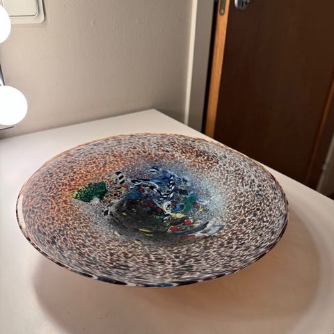 Kosta Boda dekorationsskål i blått glas med unikt mönster. Skålen är tillverkad av glas och har en rund form som passar för dekorativa ändamål.