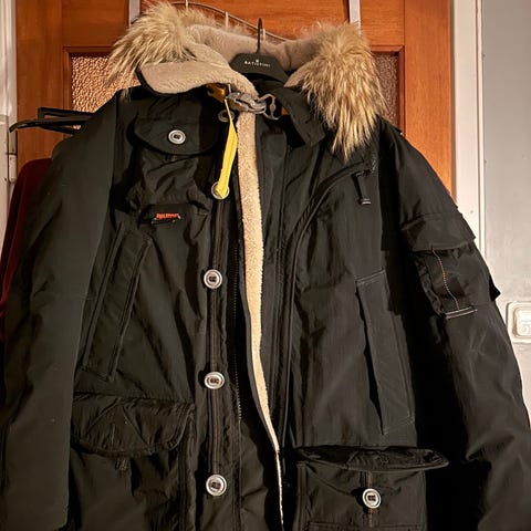 Parajumpers vinterjacka i storlek L för herrar. Jackan är svart och tillverkad av dun, vilket ger isolering och värme. Designad för kalla väderförhållanden med flera fickor och detaljer.