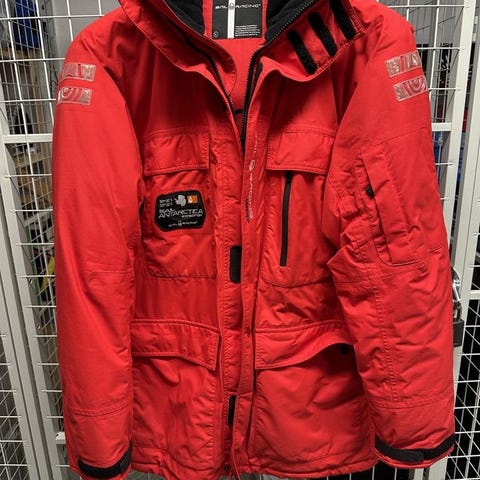 Svart Sail Racing Crystal Down Parka med huva. Jackan har flera fickor framtill och detaljer som Sail Racing logotyper och Antarctica Expedition märke.