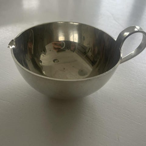 Svenskt Tenn metallmugg i silverfärgat material. Handgjord och märkt med Svenskt Tenns logotyp samt tillverkningsdetaljer. Passar för servering av drycker.