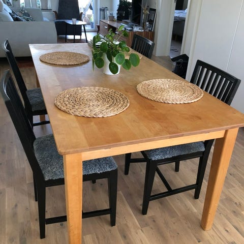 Vårt första matbord från IKEA – förvånansvärt bra kvalitet för att komma från IKEA. Det är ett riktigt träbord och väldigt stabilt och tungt. Vi säljer det eftersom vi inte har plats för det efter flytten till vårt nya hem.