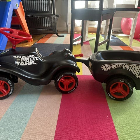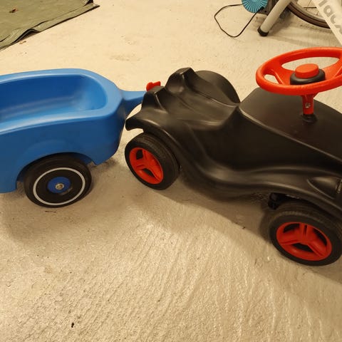 Två olika Big Bobby Cars, båda med släp. En av bilarna köptes ny med nytt släp och har alltid används inomhus. Den andra bilen köptes in begagnad med nytt släp samt ny ratt med ljudeffekter. Har av oss enbart använts inomhus.