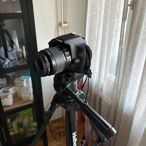 Canon DSLR-kamera med objektiv, kamerarem, batteriladdare, extra batteri och stativ. Svart färg, lämplig för fotografi av olika slag.