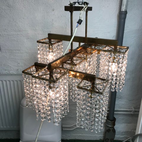 Ljuskrona svart metall med 3 stycken krokar c:a 16 cm långa totallängd 95 cm. Glaskupor c:a 17 cm långa . Om någon saknar bil och är nöjd efter att ha sett ljuskronan ( visas i trapphuset i entrén till där jag bor) så kan jag till självkostnadspris transportera den till köparens bostadsadress men endast inom Stockholms innerstad.