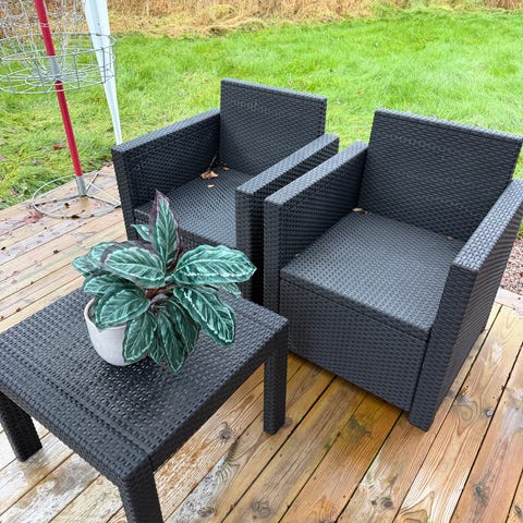 Säljer ett komplett set utemöbler i konstrotting, väldigt fint och fräscht.