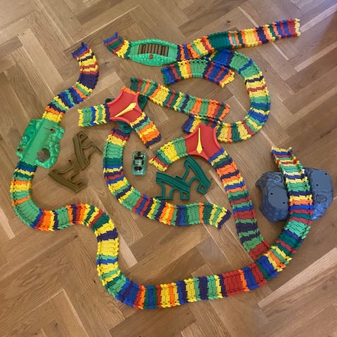 Flexitracks med tunnlar avdelare och bro. Inga bilar ingår