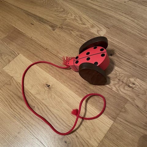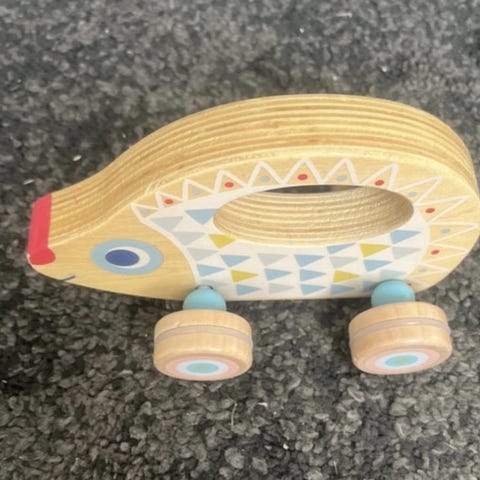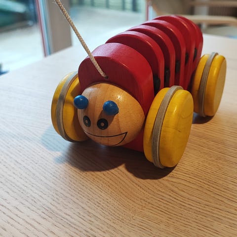 Säljer en trädragleksak i form av en elefant, en charmig klassisk leksak för små barn. Tillverkad i trä med naturlig finish och grå detaljer. Leksaken har en draglina och tre ledade sektioner som rör sig när barnet drar den.