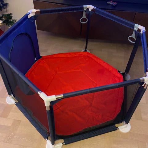 En lekhage vi köpt när vi fick vårt första barn, använd i 1,5 år av ett barn här hemma, lekt med sina leksaker i ringen. Kommer från ett hem med en katt. Lätt att bygga ihop och ta isär när man vill lägga undan den. Hämtas i Piteå, betala helst med kontanter och snabb upphämtning är en prio.