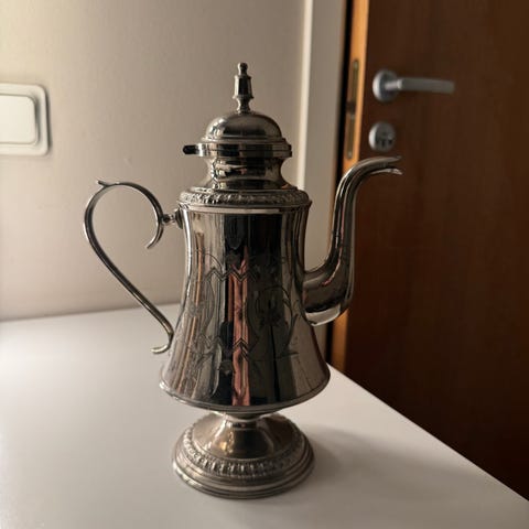 liten kaffekopp i tenn 3,5cm hög, funkar nog utmärkt till espresso eller bara som dekoration.