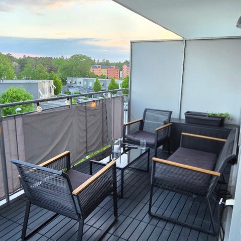 Utemöbelset i metall bestående av ett runt bord med parasoll och två stolar. Möbelsetet är utformat med dekorativa mönster och är lämpligt för utomhusbruk på balkong, veranda eller trädgård.