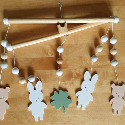 Jabadabado barnmobil med hängande djurfigurer i plast. Mobilen är utformad för att fästas vid barnsäng eller liknande och har en böjd arm i plast för upphängning. Passar för att stimulera och roa spädbarn och småbarn.