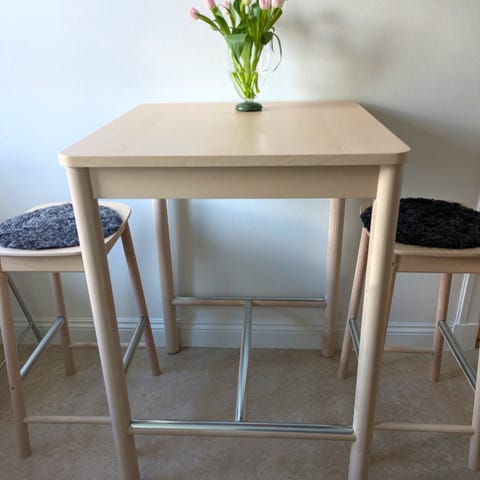 Säljer ett snyggt och gediget barbord tillsammans med fyra barstolar. Perfekt för kök, det tillverkad från AZ Design