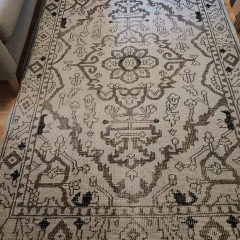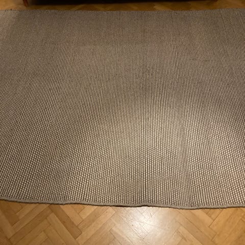 Handvävd 100% ullmatta från Mio (modell utgått) i färgen mörk moss/ blågrå. Mattan har en beige kant på vardera kortsida.