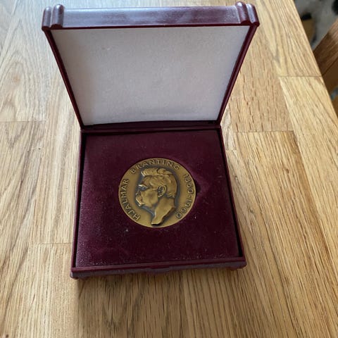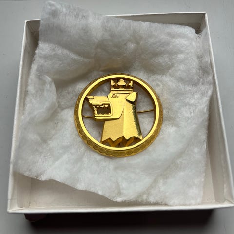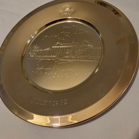 Georg Jensen Juldekoration från 1995 i guld. Dekorationen föreställer en julscen med renar och stjärnor, tillverkad i metall med guldfinish. Levereras i originalförpackning.