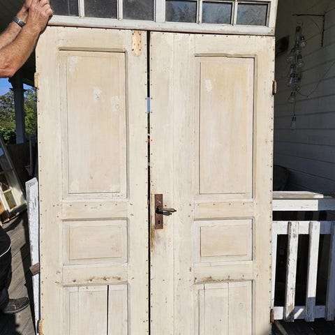 Vi har bytt ytterdörr då jag inte hade tiden och kunskapen att fixa till den gamla. Förutom ytskikt behövs nya gångjärn och lås samt spärren som man fäster dörr två med i överkant behöver bytas (kärvade när vi skulle plocka ut den). Karmmått (yttermått) bredd ca 140 cm, höjd ca 209 cm Endast avhämtning!