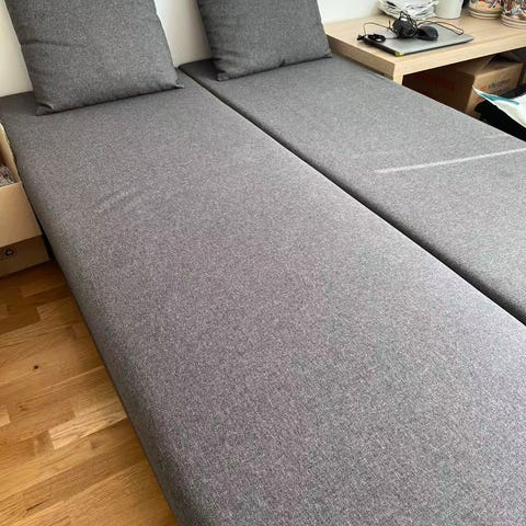 Vanlig grå bäddsoffa från IKEA. Synligt använd men inga större kosmetiska eller praktiska skador.