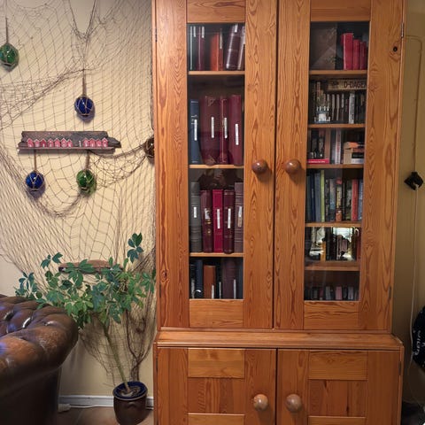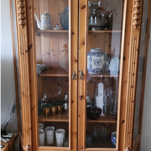 Rejält och mycket fint stort skåp syrabetsad furu med massor av förvaringsmöjligheter likväl som display/vitrinskåp.