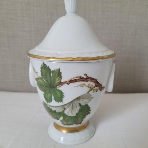 Söt sockerskål från Hackefors med lock. Dekorativ detalj med guldkant och rödbrunt mönster.