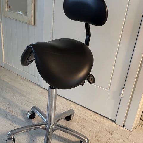 Sadelstol med svart sadelklädsel och rund träbas. Stolens design möjliggör aktivt sittande och förbättrad hållning. Basen är tillverkad av trä och sitsen är klädd i svart tyg.