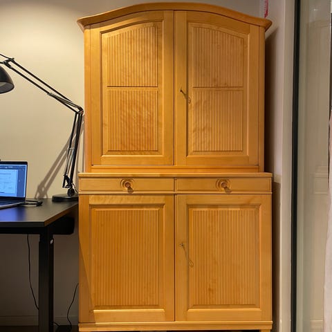 Malmstens vitrinskåp Undantaget i mahogny med belysning (original). Skåpet har en elegant inbyggd serveringsskiva. Två nycklar finns. Ett mycket trevligt skåp av hög kvalité.