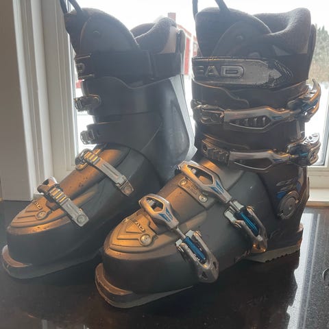 Lange skidpjäxor i blå färg med tre justerbara spännen. Skidpjäxorna är utformade för att ge stöd och stabilitet vid skidåkning. Uttagbar sula för smidig torkning, bekväma med thermo fit sula.
