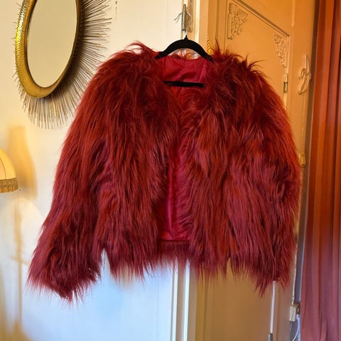 Säljer en fantastisk och ovanlig röd fårskinnshalsduk, köpt på Gotland ca 15 år sedan.