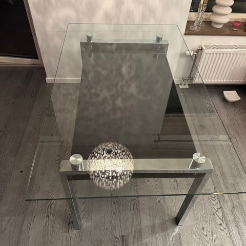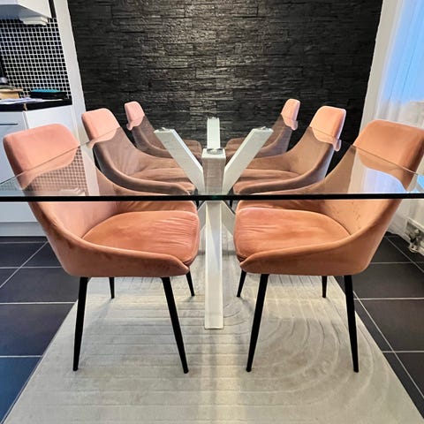 Det som ingår är: 4 st Kökstolar svarta och ett mörkt glasbord svarta ben.