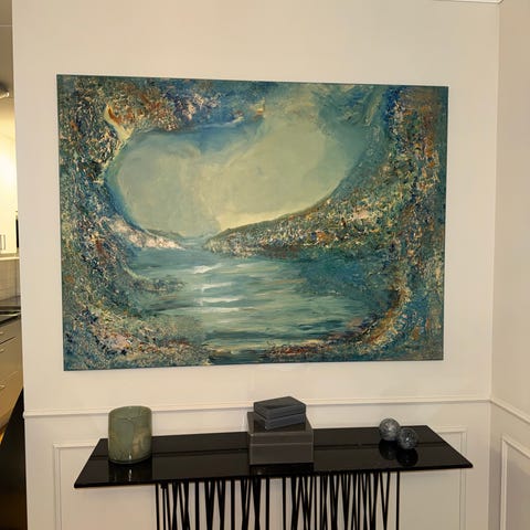 Tavla målad av Artbymonyas med akryldetaljer föreställande ett landskap. Målningen har en texturerad yta med inslag av gröna, gula och blå färger.