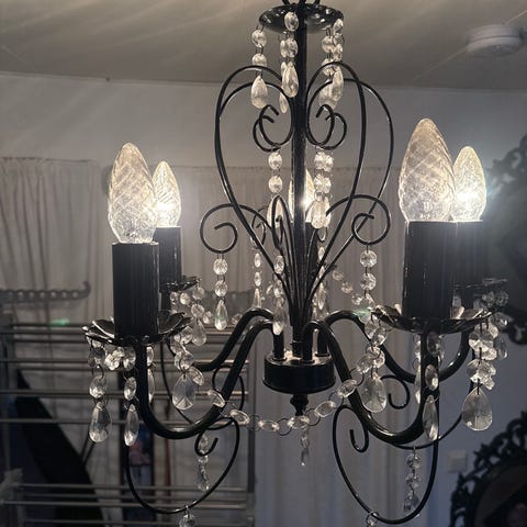 En femarmad fin antikvit ljuskrona med glasprismor. Kan levereras i närområdet.