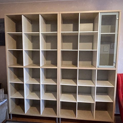 IKEA bokhylla i trä med fem hyllplan. Passar för förvaring av böcker och andra föremål. Enkel design i trämaterial.