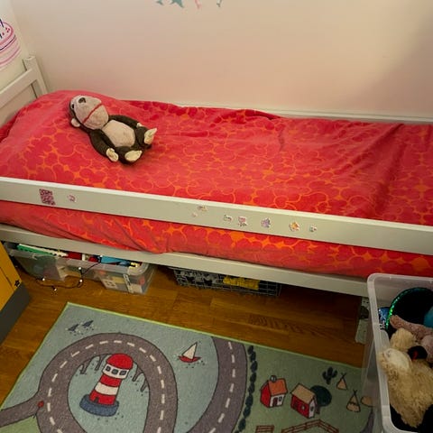 IKEA juniorsäng avsedd för barn. Sängen har en ram med måtten 165 cm i längd och 22 cm i höjd. Den är utformad med sidoräcken för säkerhet och passar för barn som behöver en juniorsäng.
