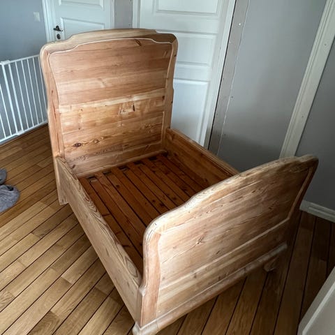 90 cm bred och blir cirka 170-180cm lång när den dras ut till max. Enkel att bära då den delas i tre delar. Riktigt härlig gammal säng. Dock fattas knoppar till huvudgaveln.