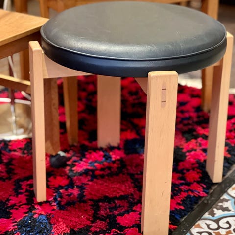 Inser att jag inte hinner renovera den. Tyget är trasig men dynan/skivan, som är "böjd" för att passa pallen är intakt.