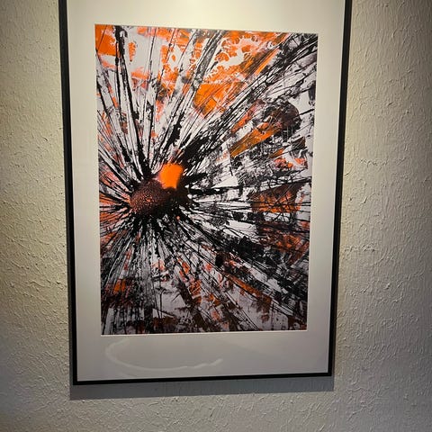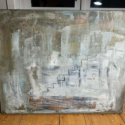 Abstrakt konstverk som visar en kombination av silver och guldtoner med olika texturer och mönster. Passar som dekorativ väggkonst i olika rum och miljöer. Dansk konstnär från Espergærde signatur FB Mått 100*82cm. Köpt för ca 5.000 DKK