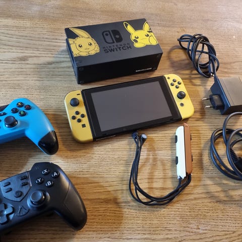 Nintendo Switch Pikachu Edition spelkonsol med gul Joy-Con-kontroller. Inkluderar laddare och förvaringsväska med Pikachu- och Eevee-motiv. Konsolen är avsedd för spel och underhållning.