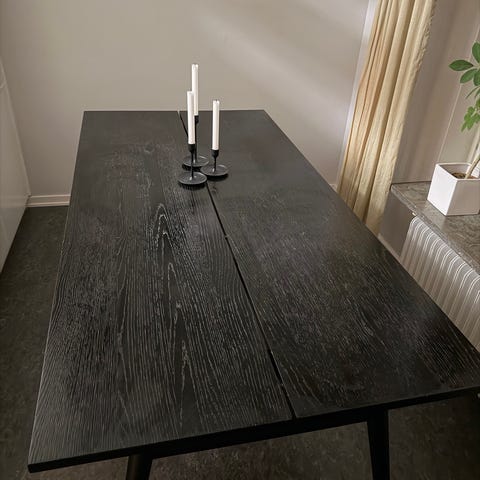 Matbord med toppskiva av MDF klädd i terrazzo-folie. Underrede i metall. Har en smidig kvadratisk form som ger varje sittande lite mer yta vid bordet än ett runt bord på samma kvadratmeter upptagen. Säljer då jag ska flytta!