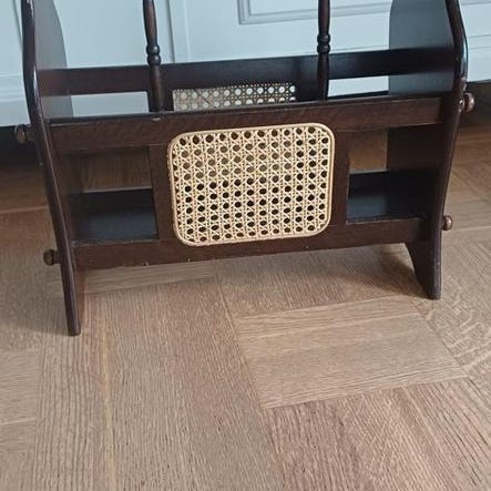 Magasinhållare med mörk brunt läder och stål. Designad för att hålla tidningar eller magasin organiserade och lättillgängliga. Passar bra i vardagsrum eller kontor för förvaring av läsmaterial. Dansk design vara, mycket snygg. Köpt för 6.500 DK